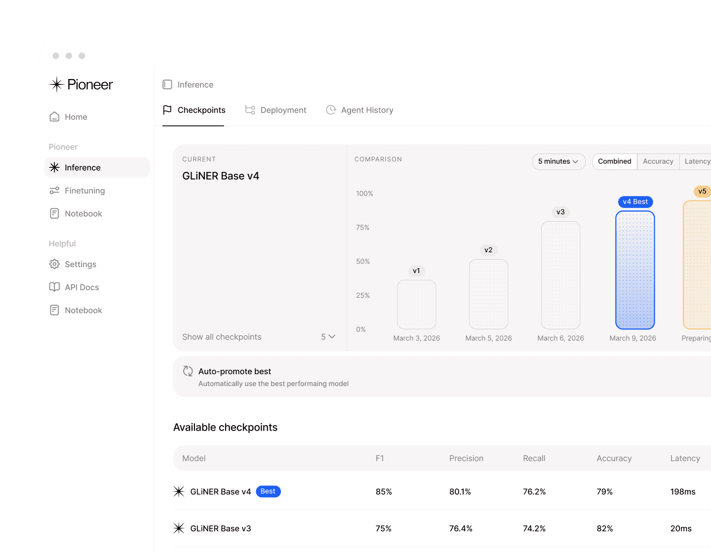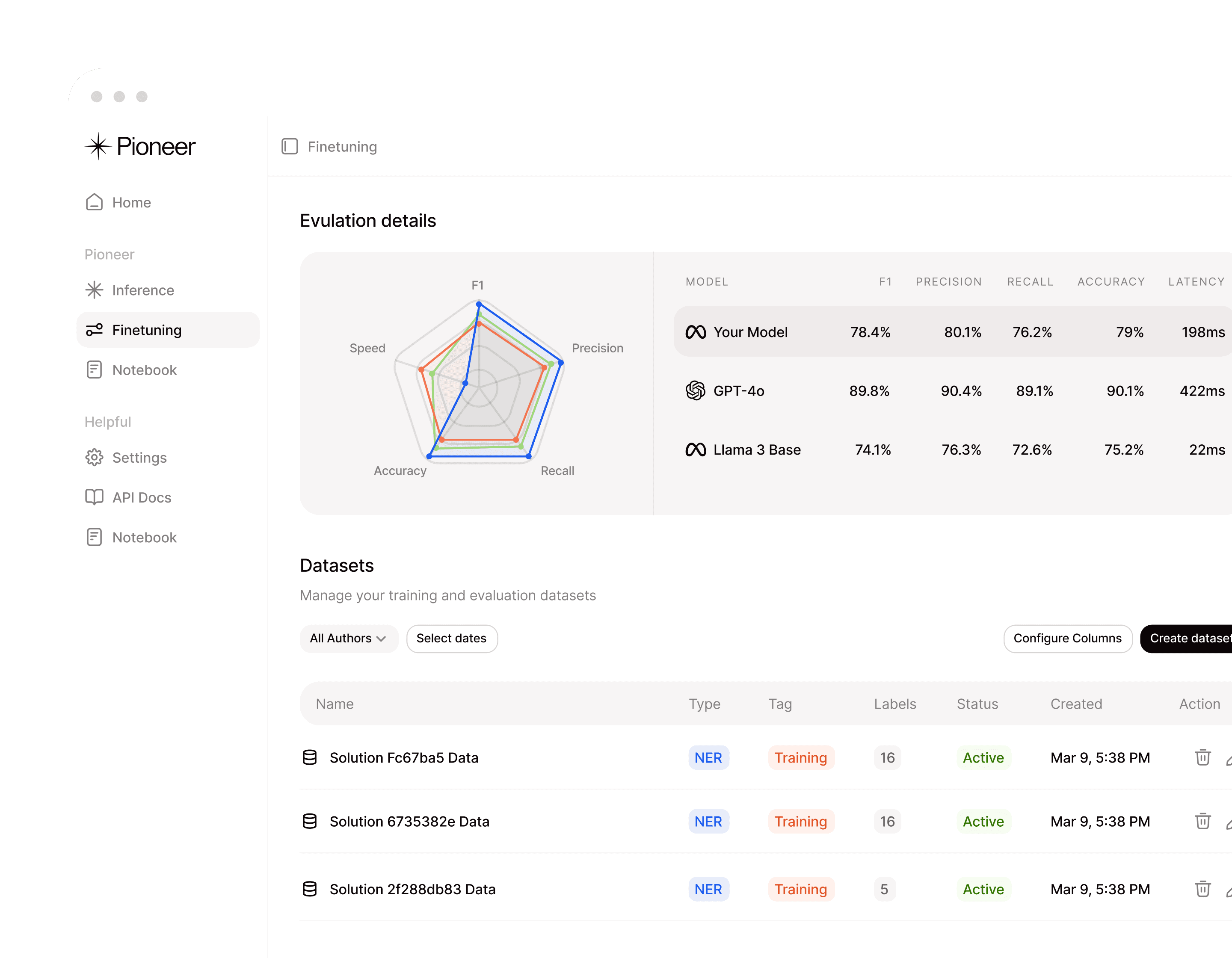 Pioneer automatically retrains baseline OSS models on live inference data — continuously adjusting weights to improve accuracy over time